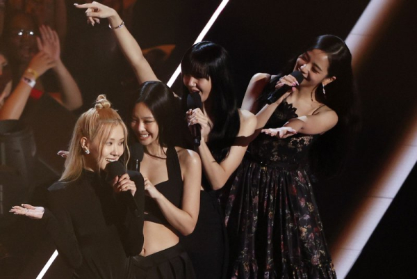 1 of 3 | Blackpink speak on the stage at the MTV Video Music Awards at the Prudential Center in Newark, N.J., in 2022. File Photo by John Angelillo/UPI | License Photo