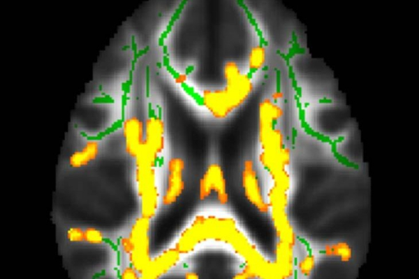 1 of 2 | This image showed increased neuroinflammation (yellow colors) with higher hidden fat in the brain’s white matter in the cohort of participants with an average age of 50 years. The green colors are normal white matter. Photo by Dr. Mahsa Dolatshahi/Radiological Society of North America