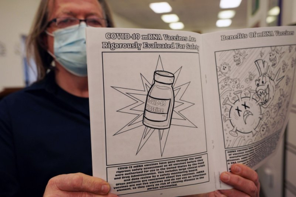 Wayne Bell, founder and CEO of Really Big Coloring Books Inc., displays a new coloring book for children on vaccinations in Olivette, Miss., in 2021. File Photo by Bill Greenblatt/UPI | License Photo